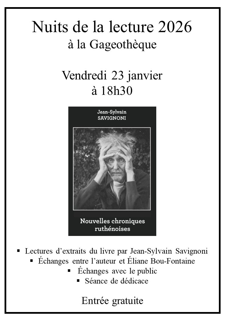 Vendredi 23 janvier à 18h30, la Gageothèque aura le plaisir d'accueillir Jean-Sylvain Savignoni. Il nous lira des extraits de son dernier livre, Nouvelles chroniques ruthénoises, riche d'histoires du vieux Rodez. Avec son verbe, ce seront les années soixante qui ressusciteront, mais pas que... Emma Calvé, Louis Mandrin - et j'en passe - seront aussi de la partie. Éliane Bou-Fontaine lui donnera la réplique pour un moment promis aux souvenirs... La participation y est gratuite, et une séance de dédicace lui succédera.