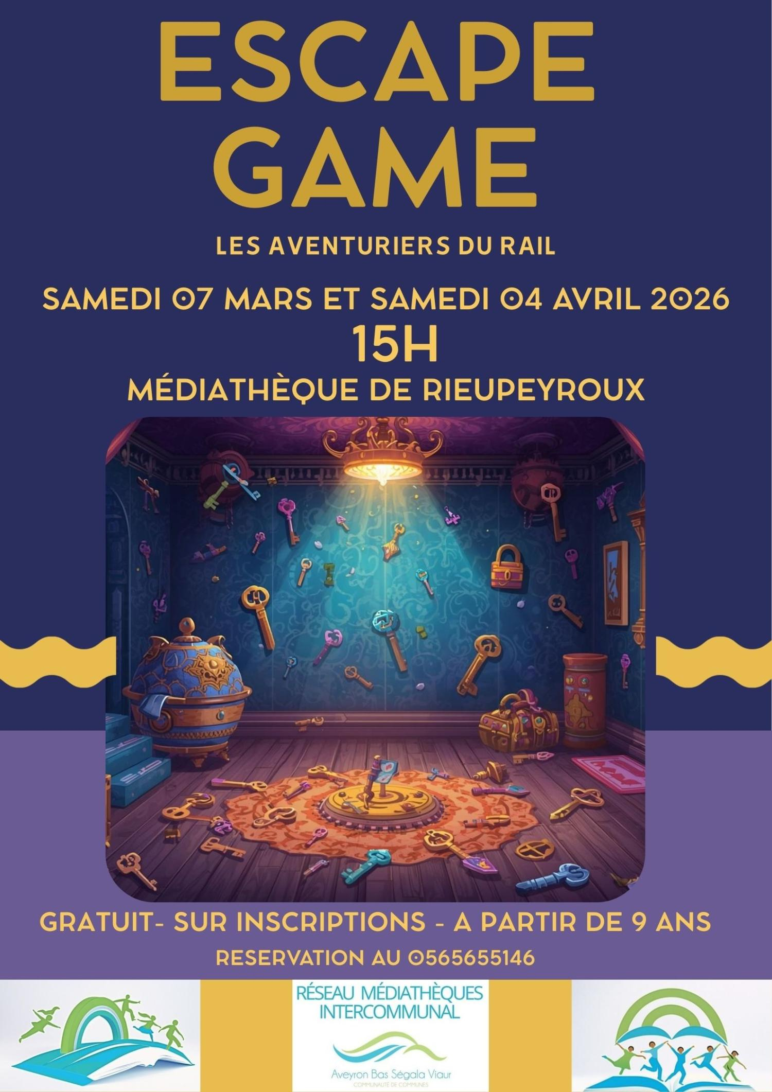 Imprimer Escape game Afficher les options de partage × Partager Détails des prochaines sessions Le samedi 07 mars 2026 de 15:00 à 16:30 Bibliothèques du réseau Aveyron Bas Ségala Viaur Evénements publics Ados Enfants Jeux